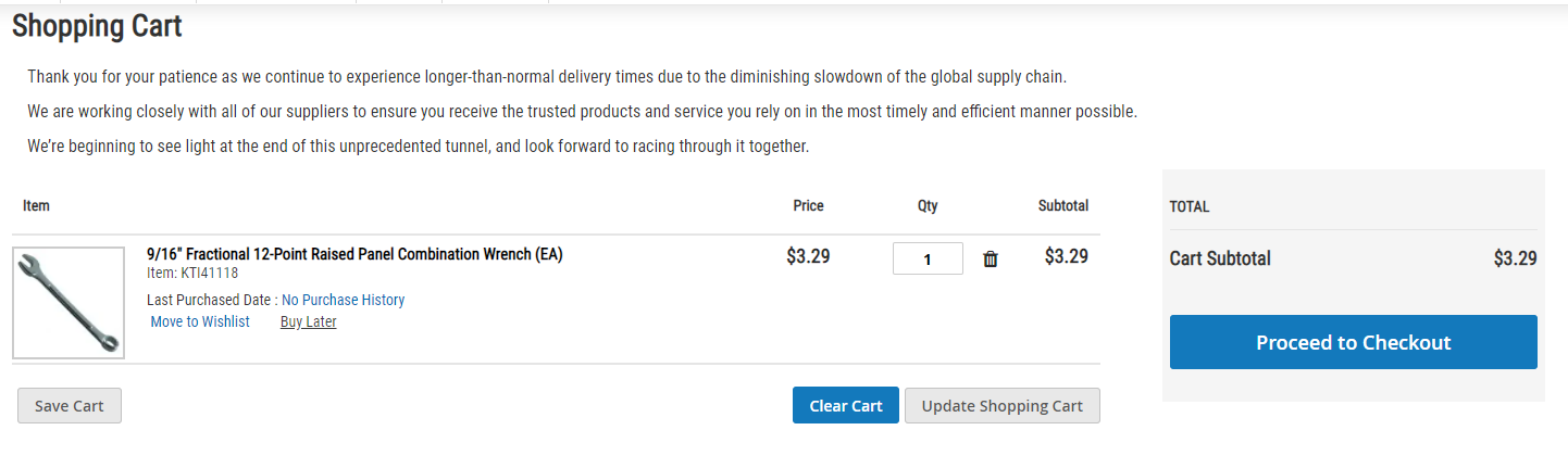 From this page you can save the cart for later, update the quantities on items in the cart, fully clear the cart, or proceed to checkout.